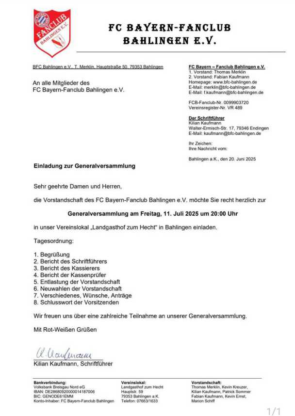 Die Vorstandschaft des FC Bayern-Fanclub Bahlingen e.V. möchte Sie recht herzlich zur Generalversammlung am Freitag, 12. Juli 2013 um 20:00 Uhr in unser Vereinslokal „Landgasthof zum Hecht“ in Bahlingen einladen.